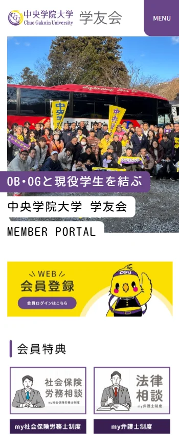 トップページでは、学友会の活動や最新のお知らせを一覧でわかりやすく表示。箱根駅伝応援バスツアーや総会開催報告、会報発送などの最新情報がひと目で確認できる構造とし、会員が重要な情報を見逃さない導線にしました。