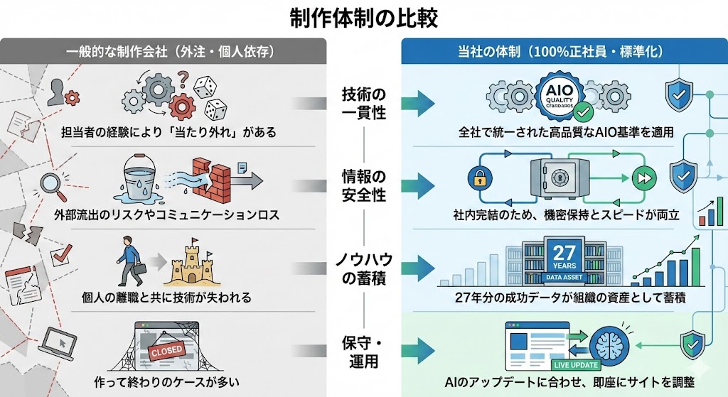 結果、成果物であるホームぺージに「当たり外れ」が発生し、お客様にご迷惑をおかけすることにつながります。